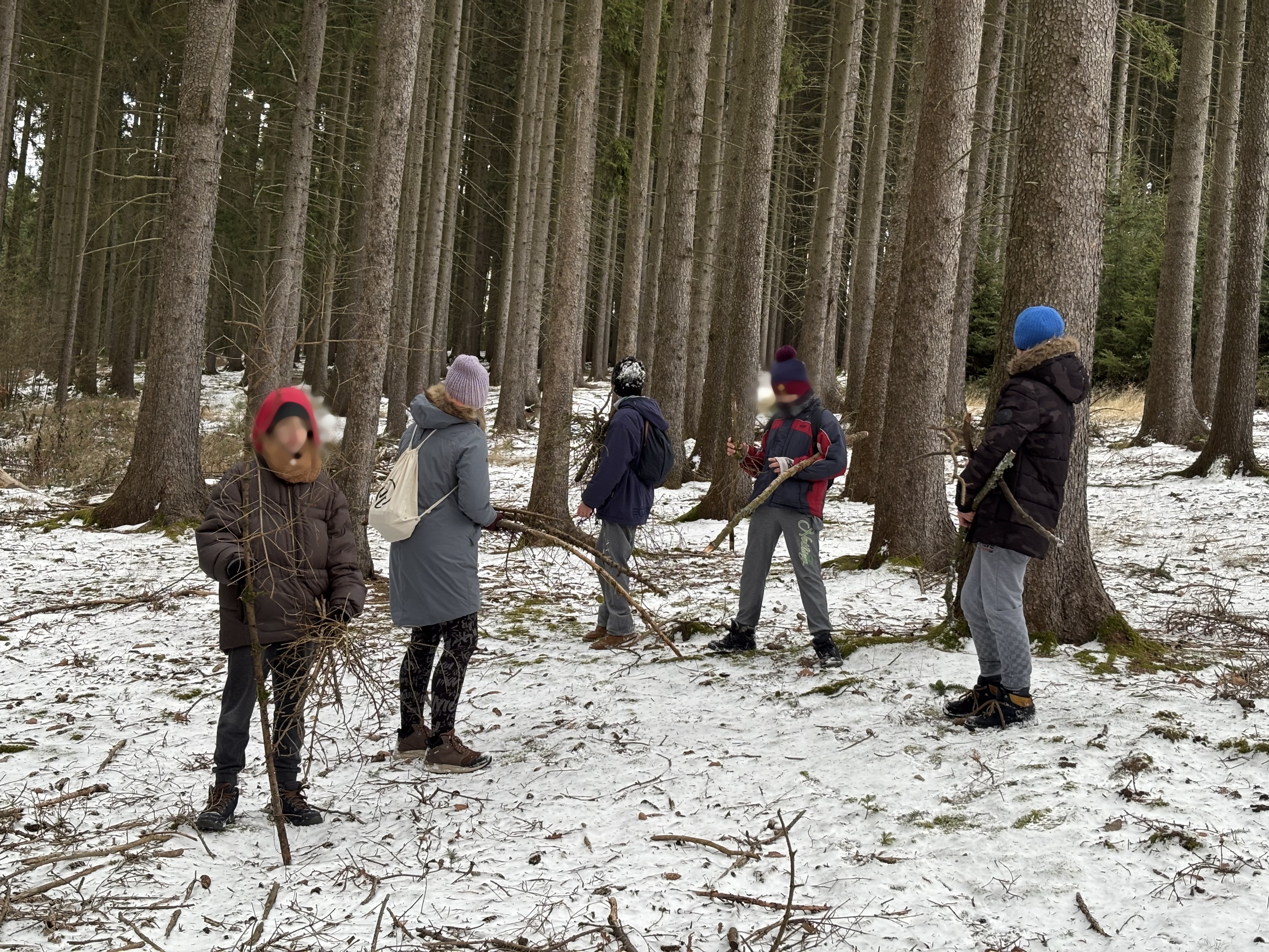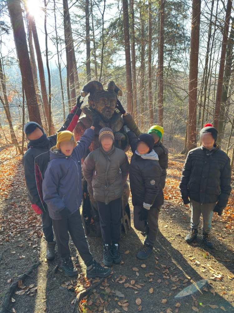 Dnešní den měli chlapci pečlivě naplánovaný. Ráno nakrmili králíky, pak si vyrobili ekologický podpalovač z vosku a kartonu. Ten jim měl usnadnit rozdělávání ohně v zasněžené krajině. Po krátké relaxaci vyrazili směr Lískovec. Zimní počasí je nešetřilo, tváře měli ošlehané větrem, ale to jim nebránilo si první sníh dostatečně užít. Těsně před Lískovcem každý nasbíral dřevo na oheň. Okamžik pravdy přišel ve chvíli rozdělávání ohně. „Bude fungovat vlastnoručně vyrobený podpalovač?“ Pár pokusů muselo proběhnout, protože vítr jim nedovoloval udržet plamen na zapalovači. Vytvořili pořádný větrolam a „HURÁ“, dřevo chytlo. Pak už stačilo jen přikládat a rychle opékat buřty, rohlíky a housky. Promrzlé ruce všichni ohřívali nad ohněm. Cestu zpět si zkrátili a tím přišli i na jinou stezku z lesa. K radosti všech kratší. Po návratu do zařízení si dali teplý čaj, který je dokonale prohřál. Dnešní den, plný zážitků si všichni užili.